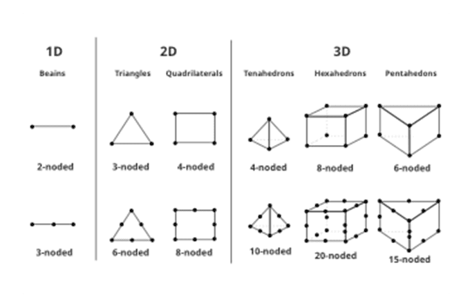 Proporciona varios tipos de elementos, como elementos de línea, triangulares, cuadriláteros, tetraédricos y hexaédricos.