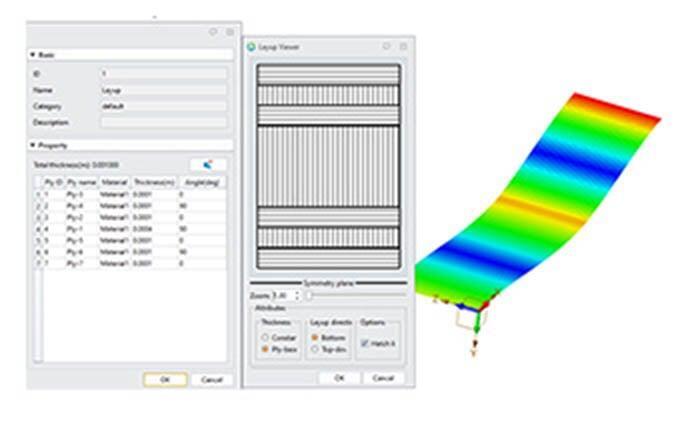 Soporta funciones de análisis de laminados compuestos. Permite el ensamblaje de laminados de materiales ortotrópicos. Proporciona 5 criterios de fallo para verificar los resultados de materiales compuestos.
